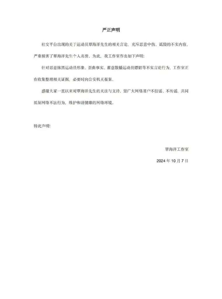 目前覃海洋本人方面暂未有任何生命,仅仅只有所属工作室做出回应
