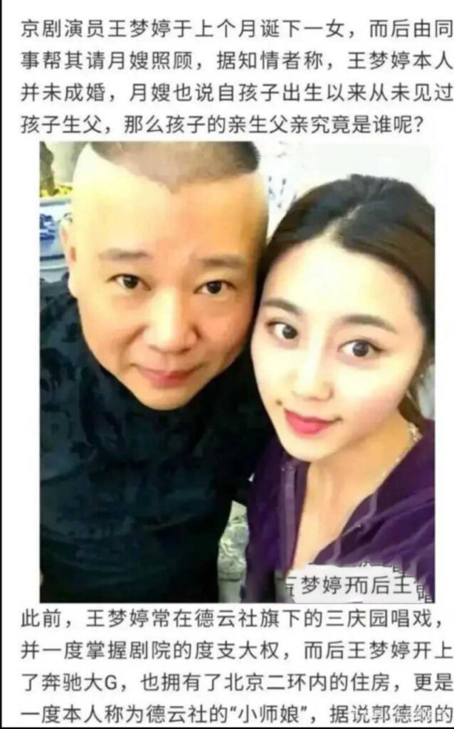 德云社班主郭德纲素有“德艺双馨”之名,近日却陷入一则争议性报道:有消息传出称其与京剧荀派花旦王梦婷存在不正当关系,甚至育有一子。