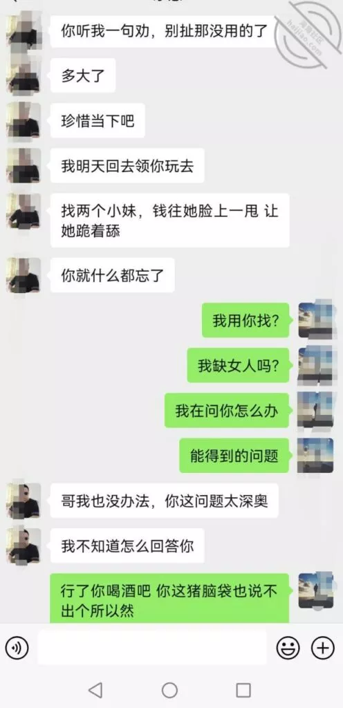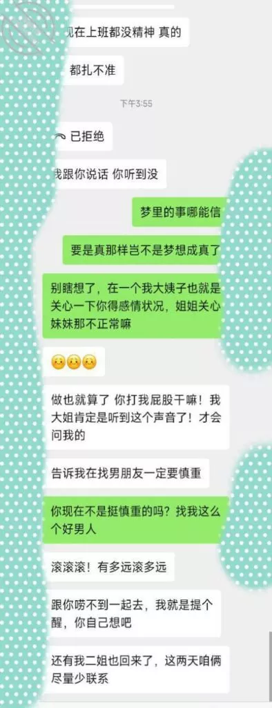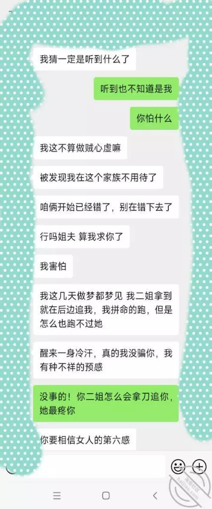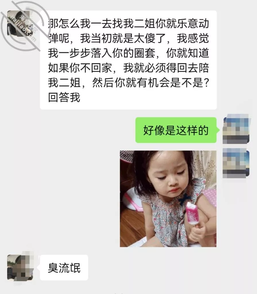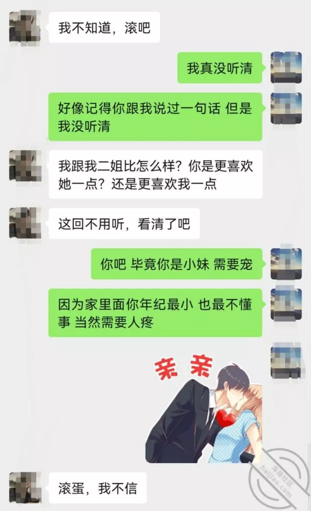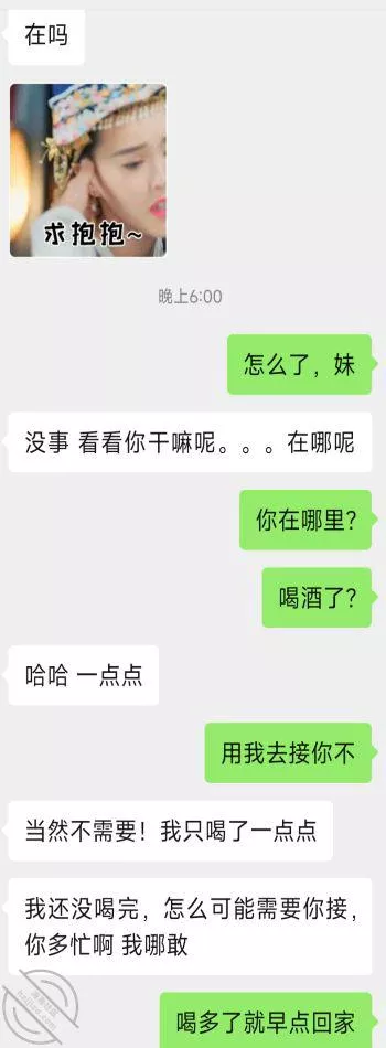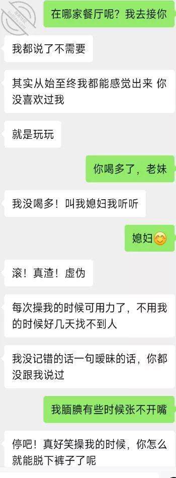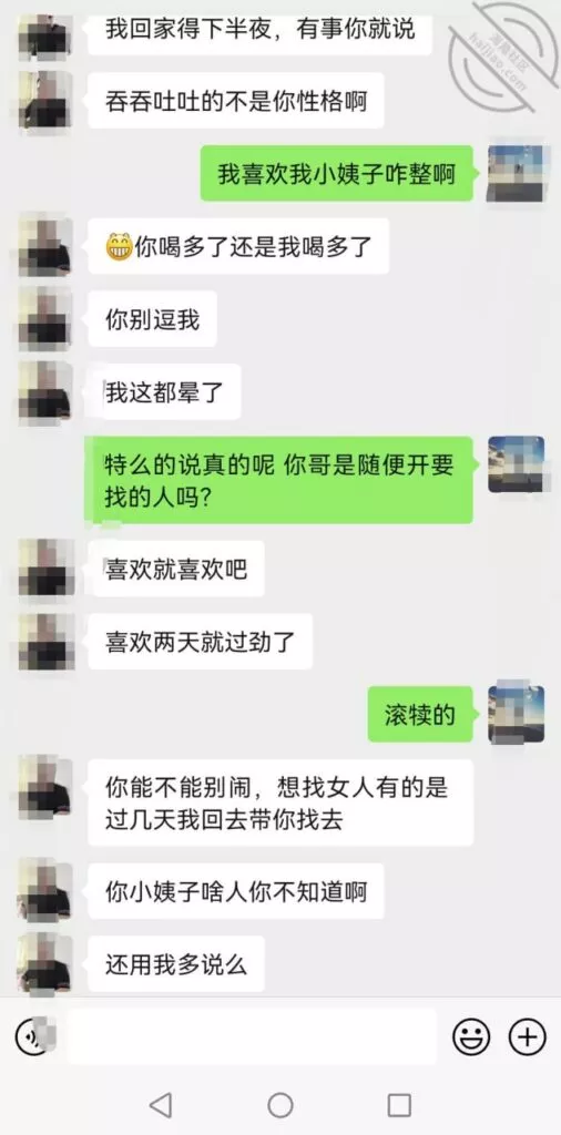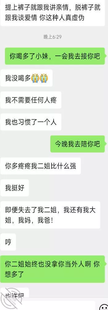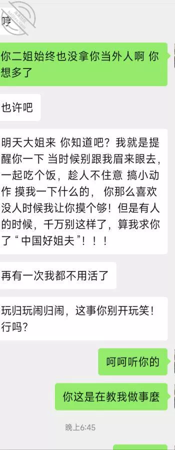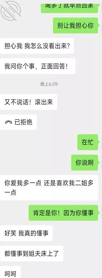 说重点今晚!我就知道小姨子主动跟我说话没好事,(差点就问我跳河先救谁了!)好奇害死猫,犹豫了半天还是回复了,正如我所料,酒后吐真言,劈头盖脸的讽刺我,弄得我很不爽,最后想想还是算了,毕竟姐三个她最小,我有错再先,谁让咱没管住吊呢!这种状态,我是真不能接她去了,接她去不但得不到便宜,扇我都有可能啊!一副家长教育孩子的表情啊!