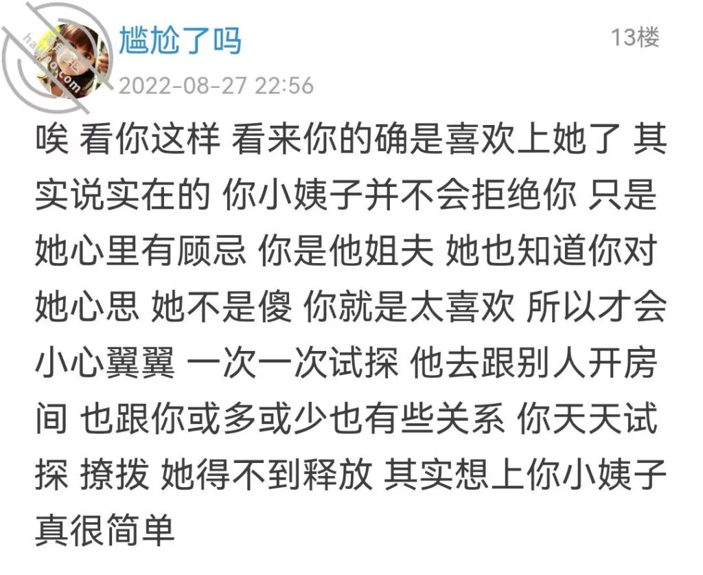 经过上次的事,我这两天也反思了很多,冷静的思考了一下,听取了一些兄弟们的意见,你们说的很有道理,爱小姨子 ,得到她的人 更重要的是她的心就是我都执念,我也应该放下执念 不要轻易对女人动真感情!除非遇到那个满心满眼都是你的女人 这两句话真的对我触动很大!谢谢你们!