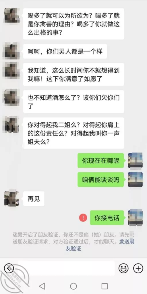 没想到接到了我老婆的电话 让我赶紧去饭店把她小妹接回来,一个女的用我小姨子手机给我老婆打电话 说喝多了,自己一个人回不了家了 说话的时候比较急!听到这,放下电话,我就受不了了,心里五味杂陈,深怕她受到一点点伤害 喝多了,在被别人上了,看海角啥样的事都有,玛德这还得了。我赶忙开车过去了,到饭店门口小姨子已经被搀扶着在门口等我,这是跟谁喝的啊,我心里挺不舒服的,但是我不知道具体情况,所以没有发作 ,心里憋着一肚子火,这么大的人了?还能把自己喝成这样,我真的不理解。