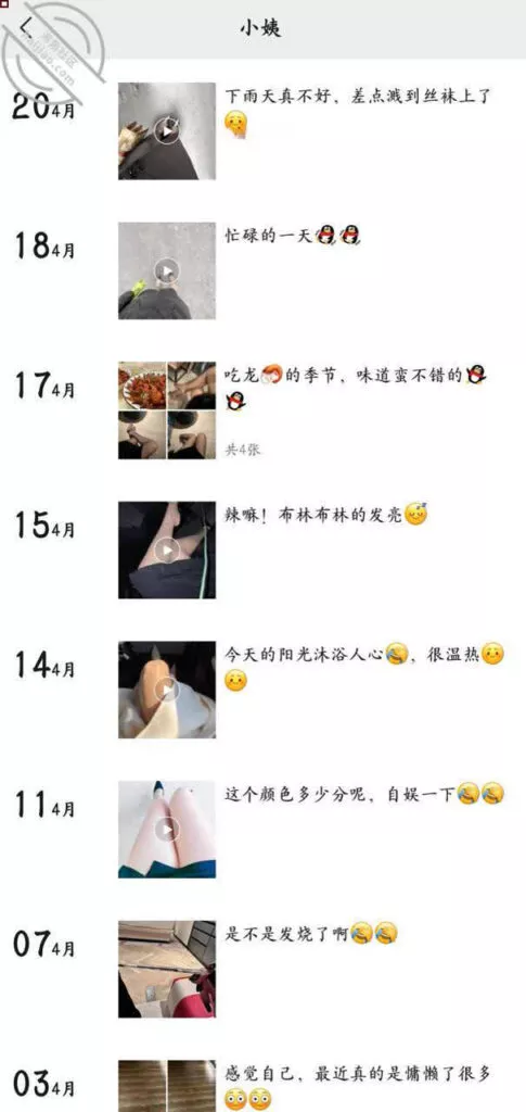 我妈她只有姨妈的电话,后面我按这个号码加了微信好友,结果发现朋友圈大多都在晒自己的丝袜腿,看得我心里痒痒的,不知道我妈她们看不看的到,有机会也得去看看这个姨妈熟络熟络。