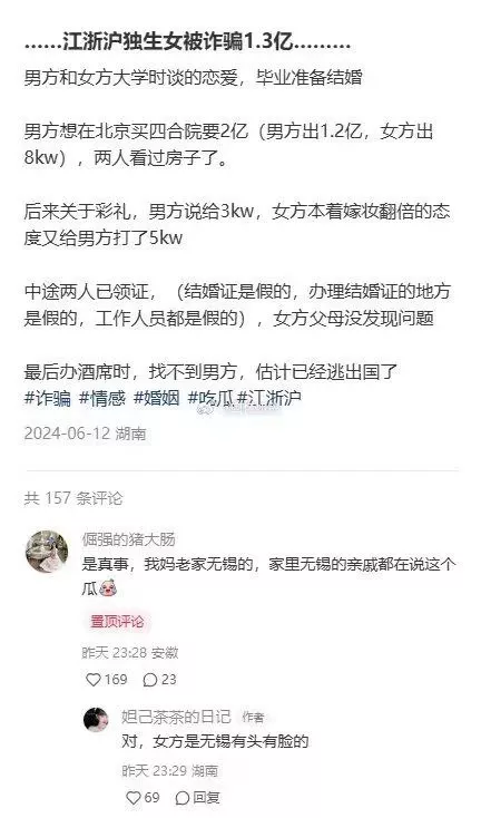 网传无锡独生女孙于斐被男友高孟宇骗走1.3个小目标。这位渣男的功力也十分了得,做戏做足了全套,假二代身份,假留学证明,假房产本,把女方一家人骗的团团转。最后成功骗到1.3个小目标后,在结婚宴那天跑路,留下女方一家人独自凌乱。