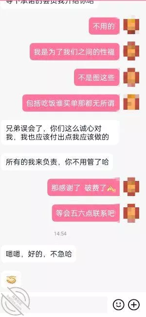 海友兄弟下午那会给我发了信息,表示包间订好了,选了一家比较隐蔽环境较好的地方,这个兄弟给我的感觉,很有素质,很诚心,也是个做大事的人,那种稳重会办事装不来的,刚才还给我开了会员(下面有聊天记录)
