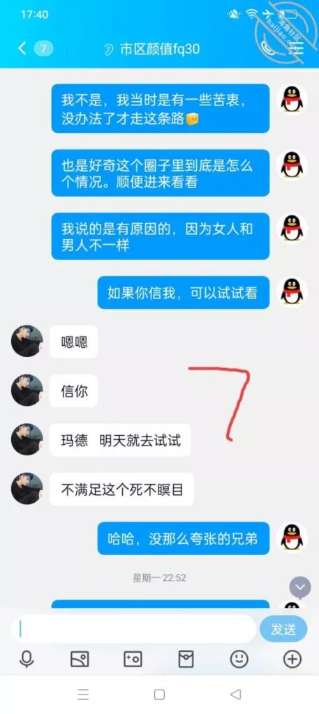 我也动了这份心思,群里找了个技师,找了几天没找到,不找的时候却发现群里有人发消息,这不是刚好随我心意。刚好这天下点雨阴天,我俩也没事,于是就预约了一个