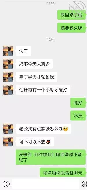 后来彼此打了招呼我都已经上了车,这时男主找到我敲敲车窗,我立马下车问他怎么了,他说她不去还是因为说尴尬,说在旁边看着很怪,不愿意,我说没事,这都属于正常现象,第一次难免的,就这样一顿安慰下,都回去了