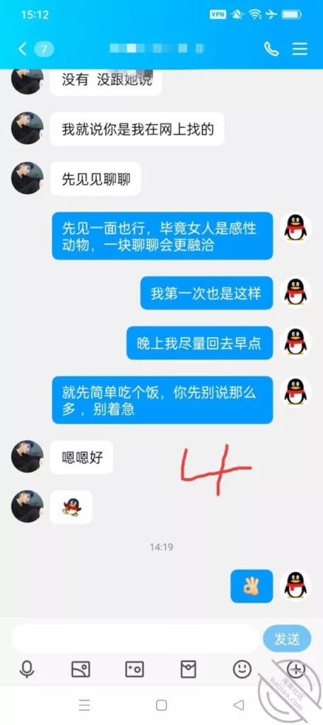 后来我看没什么问题就找了个地方吃饭,由于是首次见面我也没好拿出手机拍,最多的是和男主聊天,女主一直害羞的不停玩手机,但是我观察到时不时的会瞄我几眼,吃过饭前后都很融洽,我以为会顺理成章的晚上开始,没想到中途女主说想回去,我立马说行啊,本来目的就是简单吃个饭,见面聊聊天也挺好的