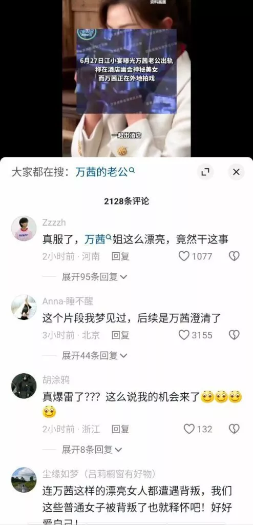 娱乐圈顶级女星万茜陷入婚姻危机,狗仔队拍到她的丈夫与一名女子前往酒店。万茜的丈夫下车后,那名女子跑了几步,将一张疑似房卡的物品递给他。随后,两人一起进入酒店。几个小时后,他们一同从酒店走出,并一起前往饭店用餐。在此期间,万茜正在剧组拍戏。