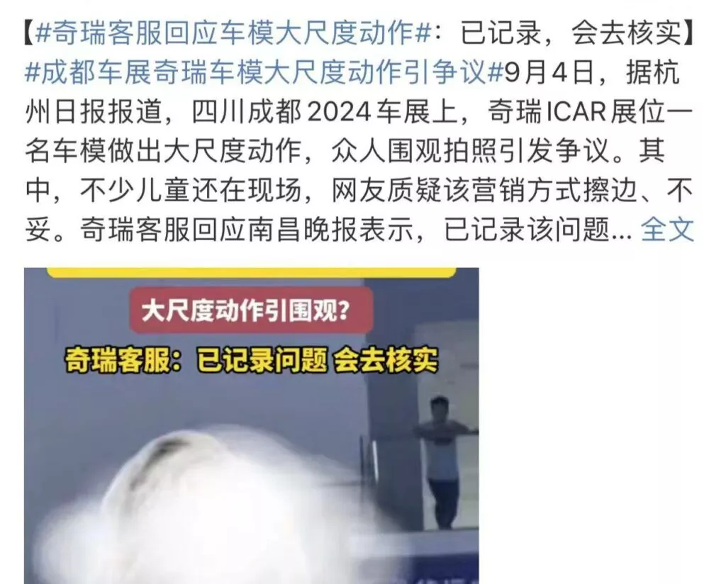 在2024年四川成都车展上,奇瑞ICAR展位的一名车模做出了尺度较大的不雅动作,瞬间吸引了全场的目光。众多记者和观众纷纷围上前来拍照,现场气氛异常热烈。然而,值得注意的是,车展上还有许多带着儿童的观众,这一行为实在令人担忧。