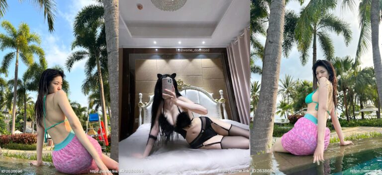本期主角以热带风情为背景,身穿绿色比基尼和粉色蕾丝短裙,展现出迷人的身材线条。她在阳光下散发着妩媚与自然的魅力,无论是在棕榈树旁坐立还是在泳池边翩然而立,她都尽显自信与俏皮。