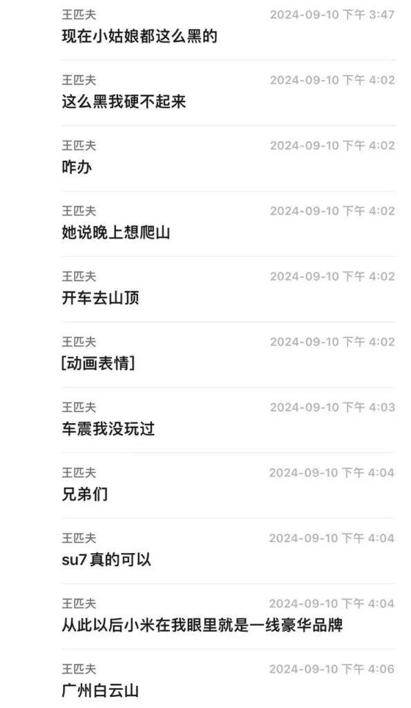 甚至开始怀疑这是否是一种新型广告。在一个网约车主的群聊中,一位司机透露,有一位美女为了能够乘坐他的SU7,宁愿绕路,而且为了拍照发圈,甚至不惜献身于车内激烈的亲密接触。